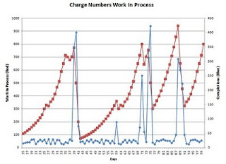 Starting at Day 15, the number of charge numbers waiting for approval is 108 (red line). Each day, that total grows larger, as the amount of time available to complete these approvals is not sufficient to keep up with the new requests. This means the process will never be able to cut into the existing WIP. At some point, shown at Day 40, the management gets too many complaints about charge numbers not being available, and they work overtime, and add more resources to complete a bunch of them over the next couple days. They complete 350, 400 and 75 over the three days (blue line), compared to a typical day of around 20-30.
