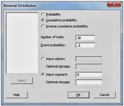 Let’s say the failure rate is 20%, so enter 0.2 for Event Probability and 10 for # of trials, with a input constant = zero (number of failures)